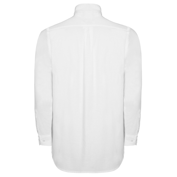 Camisa manga larga.· Tejido oxford.· Cuello clásico camisero.· Costura de hombro adelantada.· Canesú espalda.· Bolsillo en pecho izquierdo.· Tapeta con botones al tono.· Puños con abotonadura doble y pinza al lado de la tapeta de puño con un botón más pequeño.· Bajo con forma redondeada.