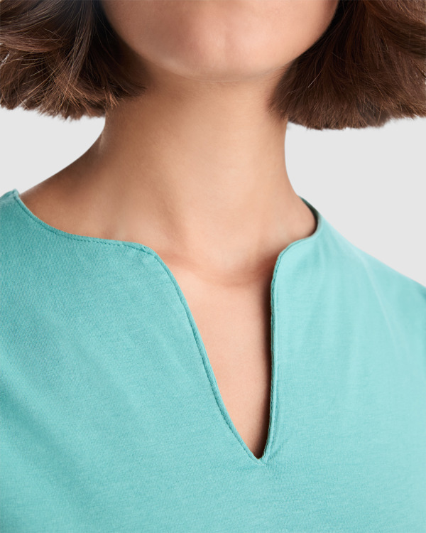 Camiseta de manga corta entallada en cintura. Algodón peinado. Escote entretelado en V. Ribete en mangas del mismo tejido al tono. Cubrecosturas en cuello del mismo tejido.