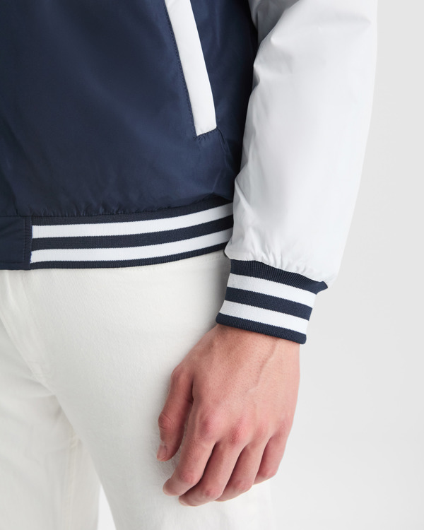 Chaqueta unisex combinada a dos colores. Ligeramente acolchada. Bolsillos laterales con cremallera y ribete del mismo tejido a contraste. Cuello, puños y bajo en canalé 1×1 con líneas a contraste combinado con el cuerpo. Botones a presión con acabado en plástico a contraste. Acceso para reprocesos en la espalda.