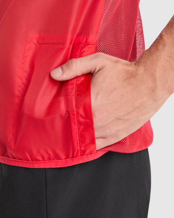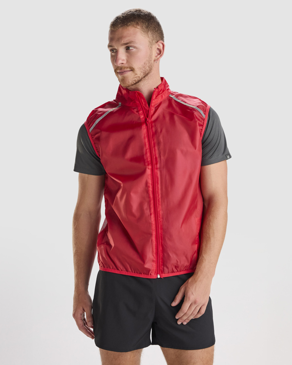 Chaleco cortavientos ultraligero. Cremallera frontal al tono. Protector de barbilla. Espalda en tejido de malla transpirable. Bandas reflectantes en el frontal y en espalda de los hombros como puntos de visibilidad aumentada. Sisas y bajo con ribete elástico al tono. Bolsillo lateral izquierdo para plegado.