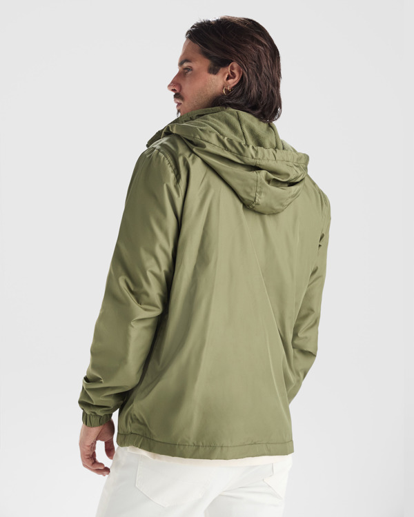 Chaqueta ligera con cremallera frontal. Repelente al agua y resistente al viento. Protector de barbilla. Capucha con cremallera extraíble y ajustadores elásticos. Puños engomados. Bolsillos laterales con cremallera y ribeteados en el mismo tejido. Bolsillo interior en pecho izquierdo. Forro interior en micropolar al tono.