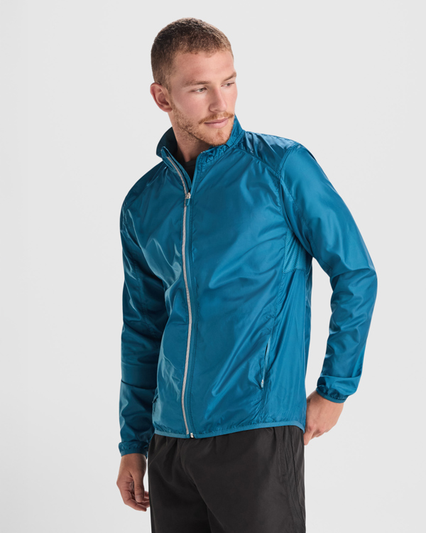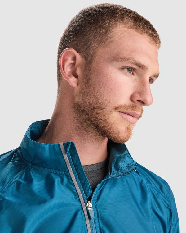 Cortavientos unisex ligero y transpirable. Cremallera frontal invertida con detalle reflectante. Bolsillos laterales con cremalleras invertidas y dos bolsillos interiores. Puños con ribete elástico al tono. Detalle reflectante en espalda.