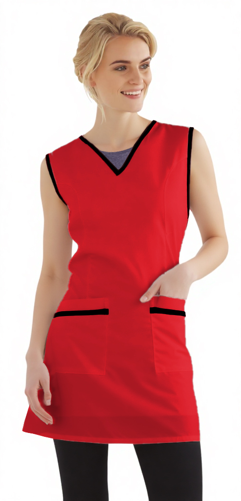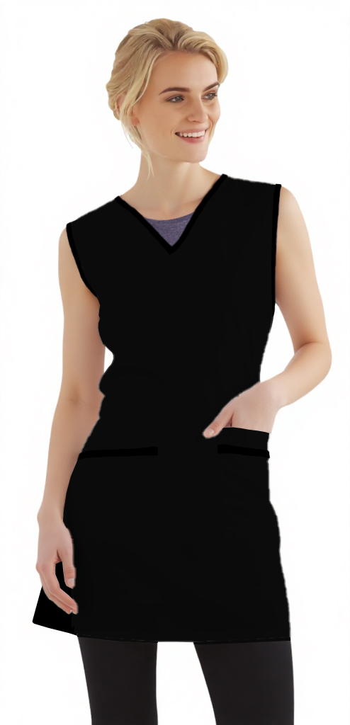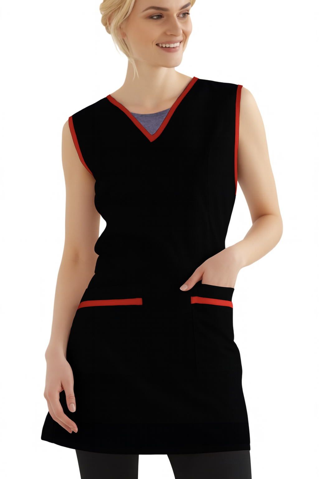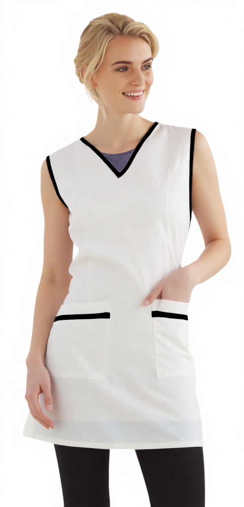 Su diseño frontal presenta un elegante escote en V que estiliza la figura, acompañado de dos amplios bolsillos de parche. Estos bolsillos son esenciales para guardar tus herramientas de trabajo, móvil o accesorios, asegurando que siempre estén a mano.