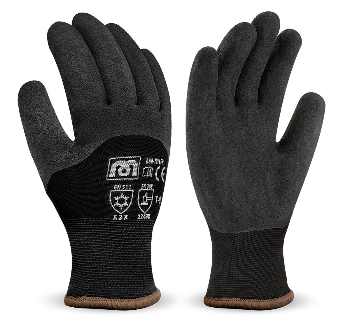 Guante de alta resistencia al frío con soporte de punto de poliéster con dorso transpirable y cubierto de látex negro en palma y uñas, con puño elástico autoajustable. Excelente grip antideslizante que proporciona un excelente agarre en condiciones húmedas y abrasivas y una excelente resistencia al desagarro.