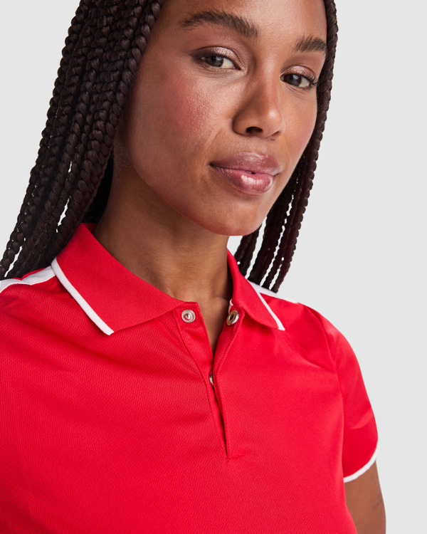 Polo técnico manga corta entallado transpirable. Antibacteriano. Aperturas laterales. Pieza en hombros y bocamanga a contraste. Cuello y puños rib 1×1 al tono con detalle a contraste. Tapeta con botones a presión, uno visible a contraste de color y otro invisible dentro de la tapeta. Cubrecosturas del mismo tejido a contraste. Certificado GRS.