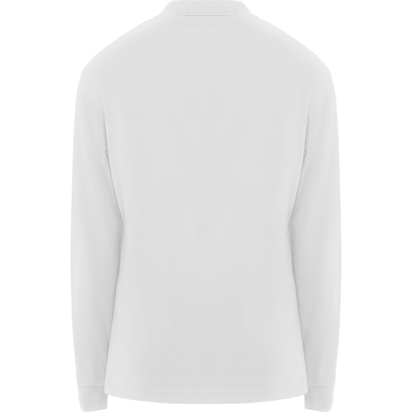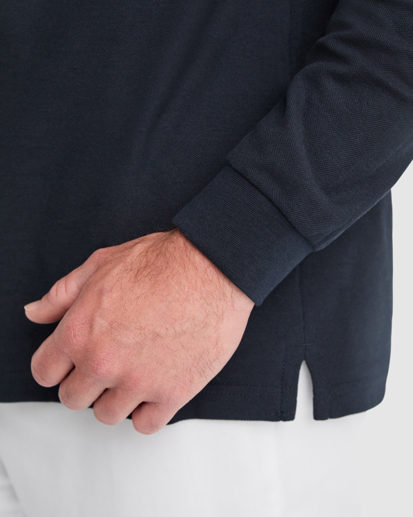 Polo manga larga de piqué. · Cuello y puños en rib 1×1. · Tapeta con cierre velcro. · Cubrecosturas del mismo tejido. · Aperturas laterales.