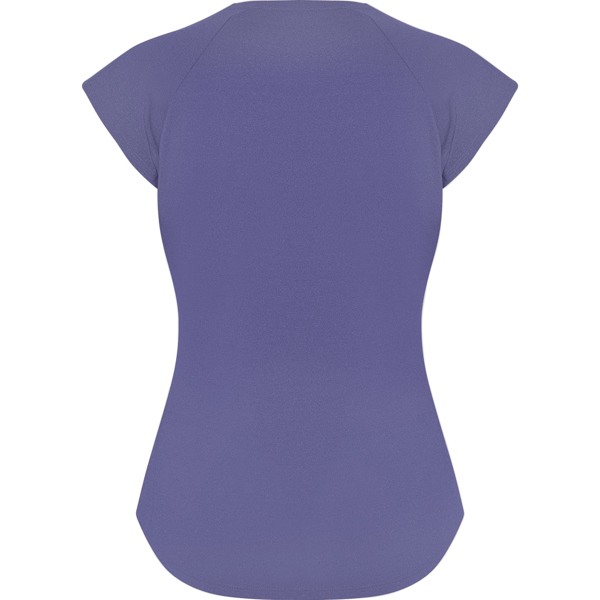Camiseta técnica multideporte para mujer con manga ranglán. Cuello pico. Tejido poliéster con tacto algodón. Corte entallado. Bajo con forma curva. Costuras overlock a tono en bajo y mangas. Logo Roly reflectante en bajo lateral izquierdo.