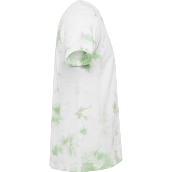 Camiseta tubular de manga corta unisex efecto Tie-Dye. Cuello redondo en canalé 1×1 con cubre costuras en cuello. El acabado y la tonalidad de esta prenda puede variar dentro de un mismo tono.