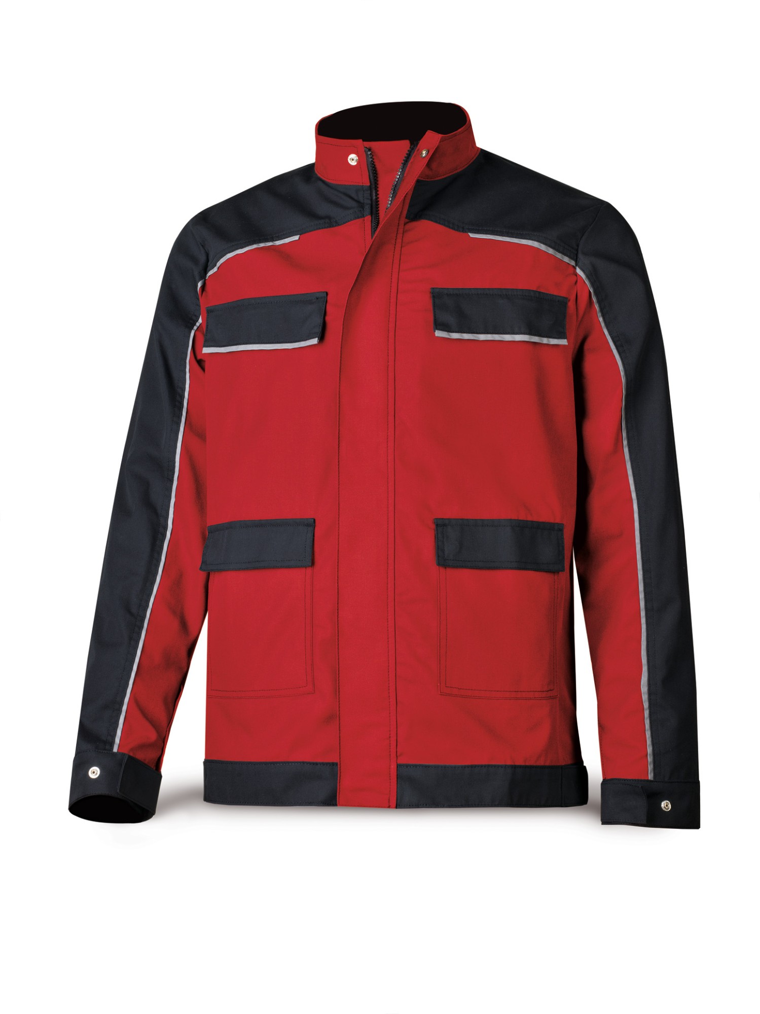 Chaqueta cuello mao, fabricada con tejido Canvas de 245 gr/m2. 4 bolsillos, 2 bolsillos de parche ubicados en el inferior de ambos delanteros y 2 bolsillos de ojal y cierre por cremallera de espiral de color negro ubicados en el superior de ambos delanteros.