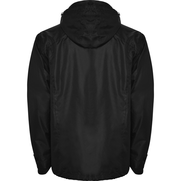 Chaqueta impermeable en tejido cuadrillé con forro interior. Cuello alto y capucha extraíble con ajustadores. Cremallera frontal inyectada y protector de barbilla. Un bolsillo en el pecho y dos laterales con cremallera. Puños con abertura para pulgar y ajustador de velcro. Dos bolsillos interiores con velcro. Ajustadores en interior del bajo.
