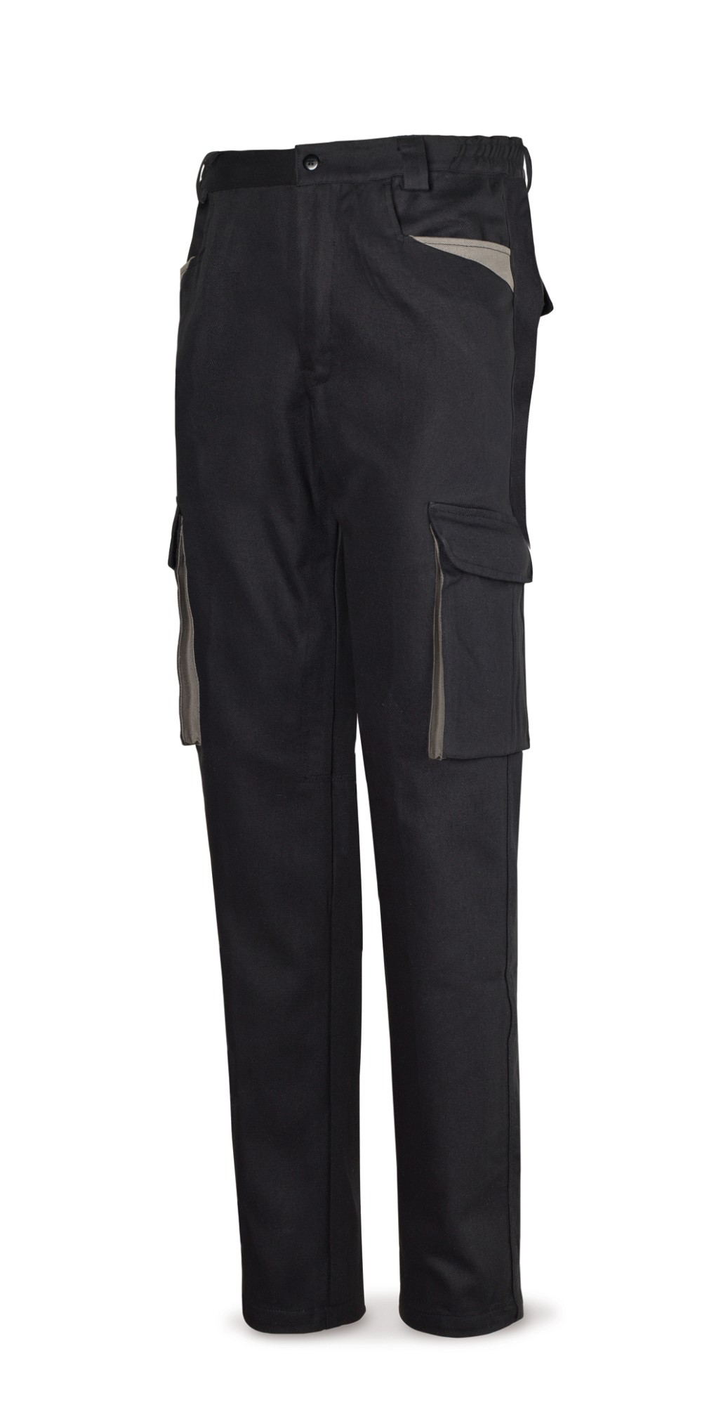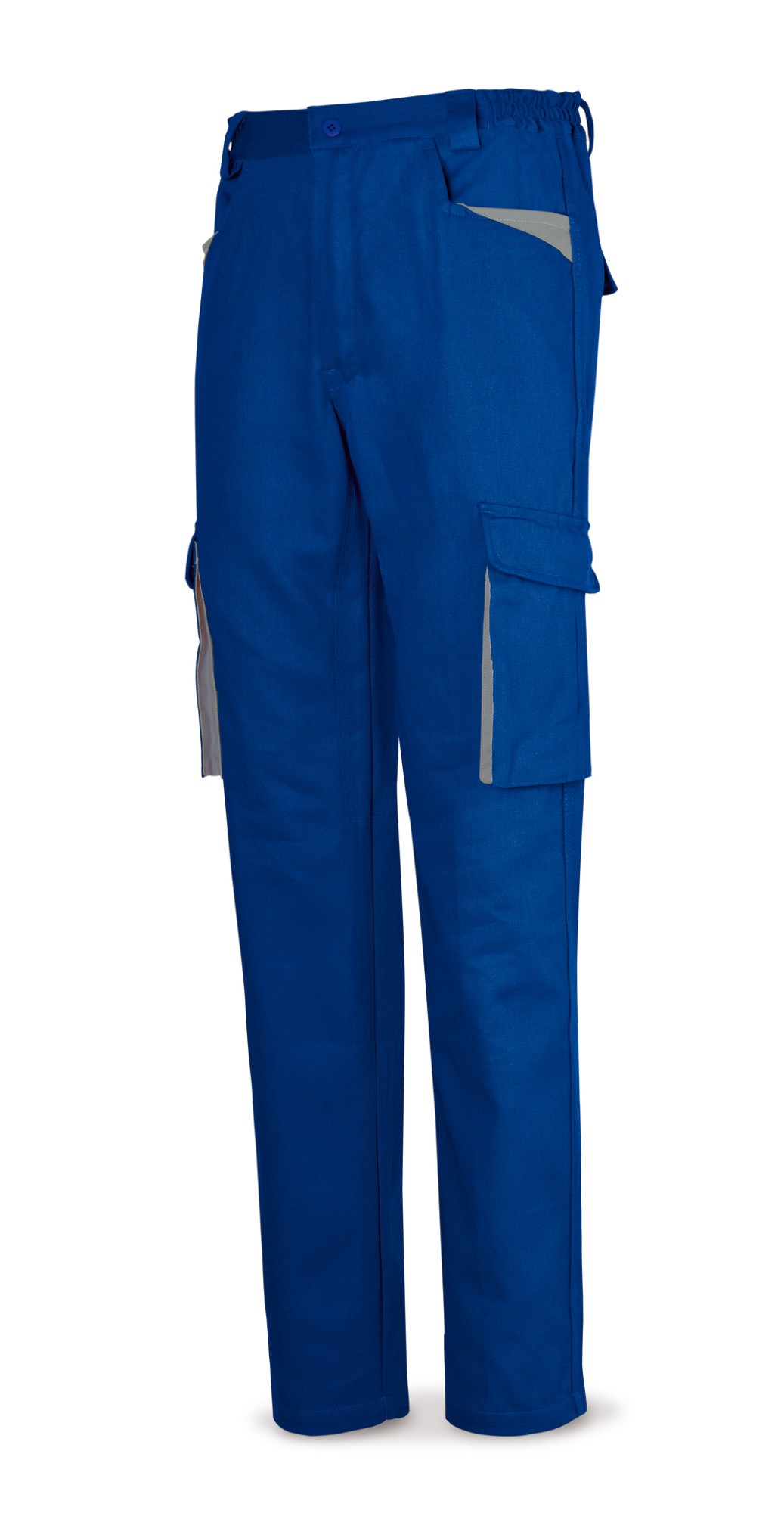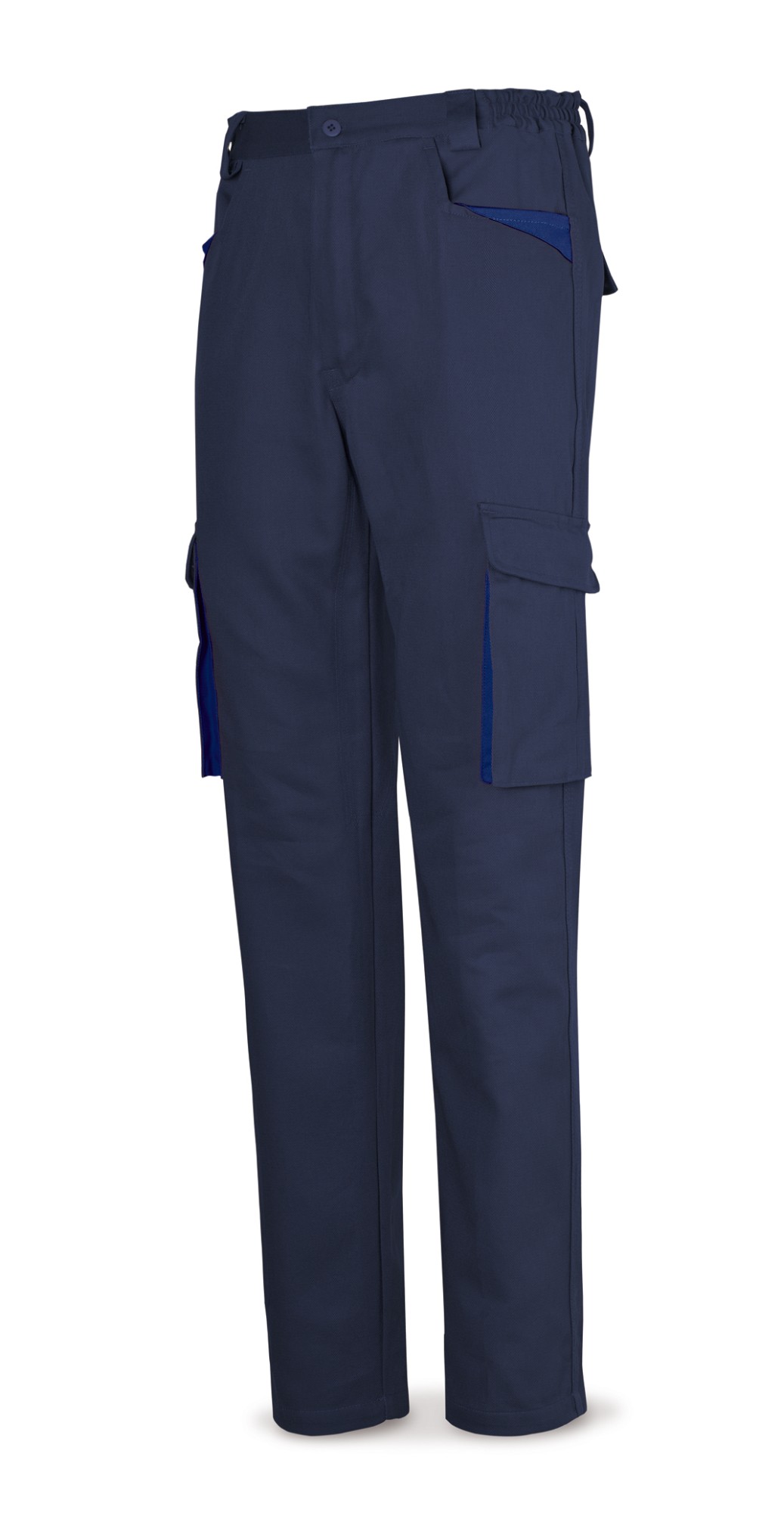 Pantalón fabricado con tejido de 270 gr/m2. Seis bolsillos: dos en cadera tipo western, dos en pernera tipo cargo de fuelle y dos traseros. Cinturilla extra alta en espalda. Trabillas extra anchas en cintura. Color azul marino con contraste en azulina.